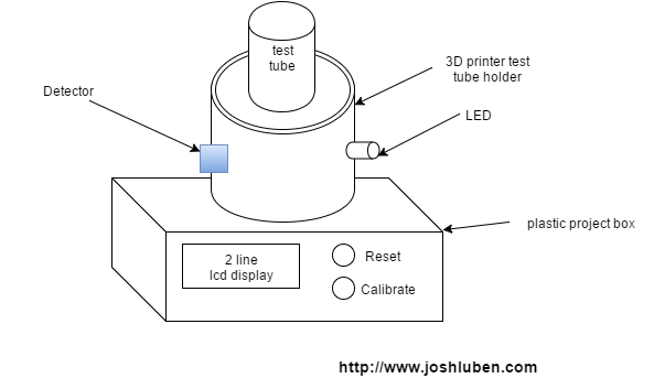 To keep this simple, I used a 3D printer to fabricate a holder for the test tubes from the science kit. A 635nm red LED shines in one side, and a BPW35 detects the light. The next step is to mount this on a small plastic project box with a cheap two line LCD display. A button (or two) will control taking measurements (and some kind of integrated calibration cycle).