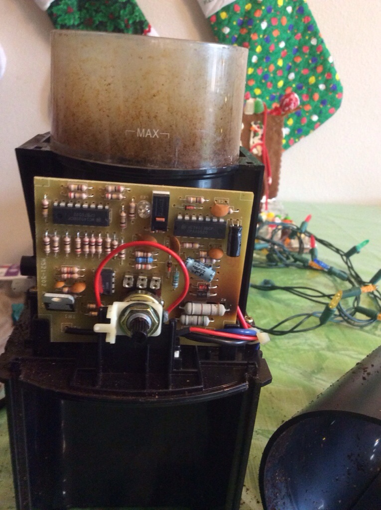My [coffee] burr grinder finally quit on me. I’ve lived without a button on the front for quite a while. I had hopes of fixing it and saving myself some big money. It took me quite a while to figure out how to open the case–turns out to be pretty simple if you know what to look for. Using a flat screwdriver, there are four detentes on the bottom. You have to know they are there to find them.